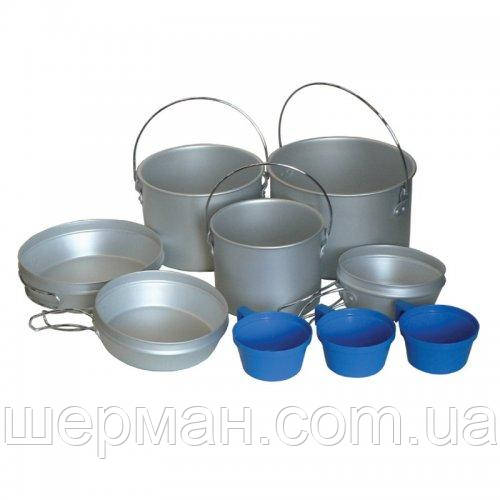 Набір походного посуду з алюмінію складається з: казанка 1,9 л, з дужкою, кришки-сковорідки зі складаними ручками, казанка 2,9 л, з дужкою, кришки-сковорідки зі складаними ручками, казанка 1,2 л, з дужкою, кришки -сковородкі зі складаними ручками, пластмасових кухлів (3 шт.)